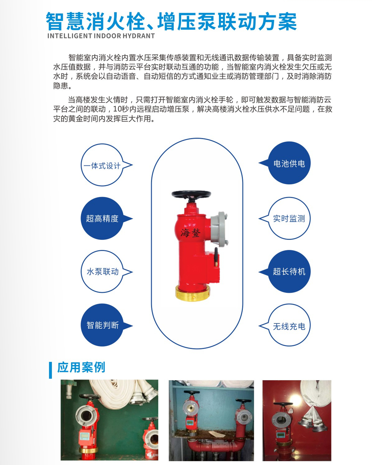 當(dāng)高樓發(fā)生火情時(shí),只需打開智能室內(nèi)消火栓手輪,即可觸發(fā)數(shù)據(jù)與智能消防云平臺(tái)之間的聯(lián)動(dòng), 10秒內(nèi)遠(yuǎn)程啟動(dòng)增壓泵,解決高樓消火栓水壓供水不足問題,在救災(zāi)的黃金時(shí)間內(nèi)發(fā)揮巨大作用。