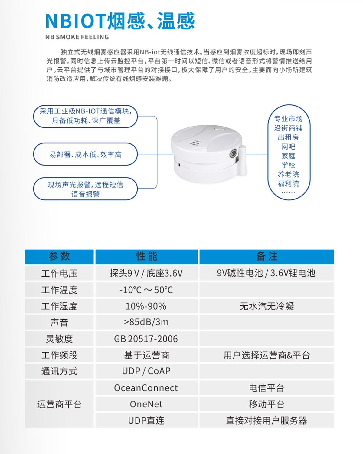 獨(dú)立式無(wú)線煙霧感應(yīng)器采用NB-iot無(wú)線通信技術(shù)。當(dāng)感應(yīng)到煙霧濃度超標(biāo)時(shí),現(xiàn)場(chǎng)即刻聲光報(bào)警,同時(shí)信息上傳云監(jiān)控平臺(tái),平臺(tái)第一時(shí)間以短信、微信或者語(yǔ)音形式將警情推送給用戶(hù)。云平臺(tái)提供了與城市管理平臺(tái)的對(duì)接接口,極大保障了用戶(hù)的安全。主要面向小場(chǎng)所建筑消防改造應(yīng)用,解決傳統(tǒng)有線煙感安裝難題。